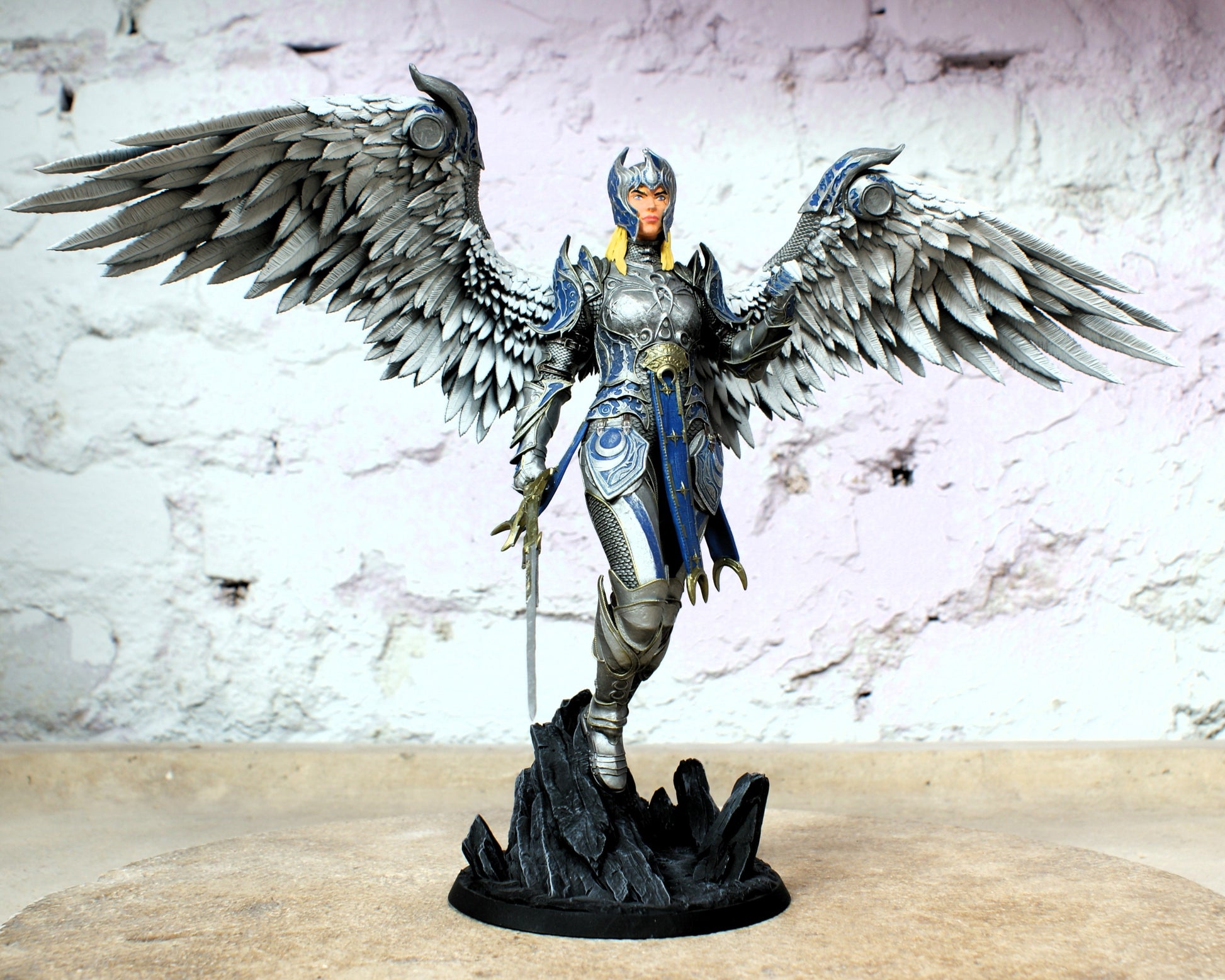 Black Base with White Drybrush Highlights: This style plays with contrasts. The black background accentuates the sculpture’s details, while the white drybrush technique emphasizes fine lines.